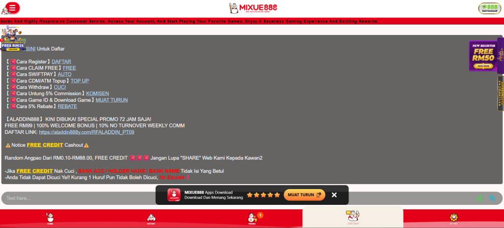 Promotions are the highlight of Mixue888, with multiple free credits and structured rebates. Current offers include: